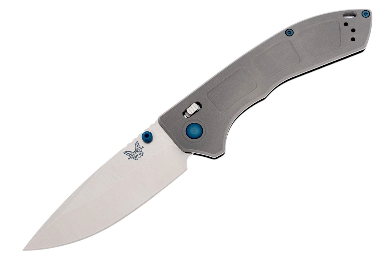 Both the 748 full-size and the 743 Mini Narrows use 6Al-4V titanium — the aerospace-grade alloy containing 6% aluminum and 4% vanadium that is the industry standard for structural titanium applications where high strength-to-weight ratio is the primary requirement. It is significantly stronger than commercially pure titanium, substantially lighter than steel, and corrosion-resistant in any carry environment. The handle scales are fully milled rather than cast or stamped, with three rectangular fullers providing both grip texture and material reduction. Despite the liner-less construction, Benchmade reports the Narrows achieves up to twice the breaking force of the Bugout — a function of titanium’s inherent rigidity versus the polymer frame of that knife.