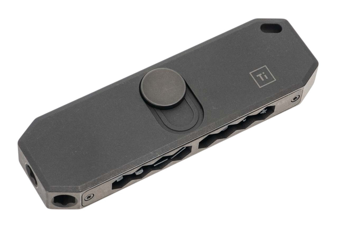The Ti EDS II is a CNC-milled titanium screwdriver that opens and locks like a frame lock knife — the tighter you grip, the more secure the mechanism becomes. It holds four 1/4-inch hex bits with internal rare earth magnets, includes a 40mm articulated extension arm, and accepts any standard bits you already own. No proprietary hardware required.