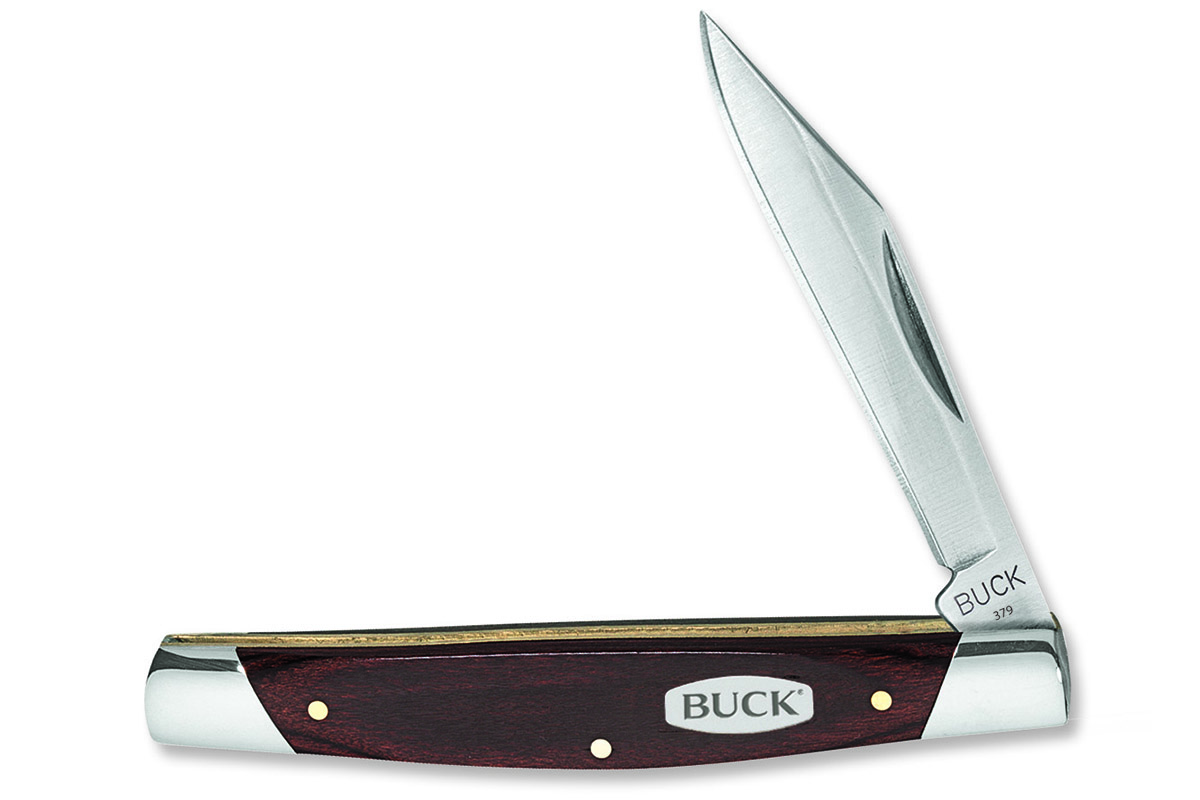 Compact, single-blade pocket knife. Woodgrain handle with Nickel Silver bolsters and inlay showcasing Buck's "Classic Bolt" logo.