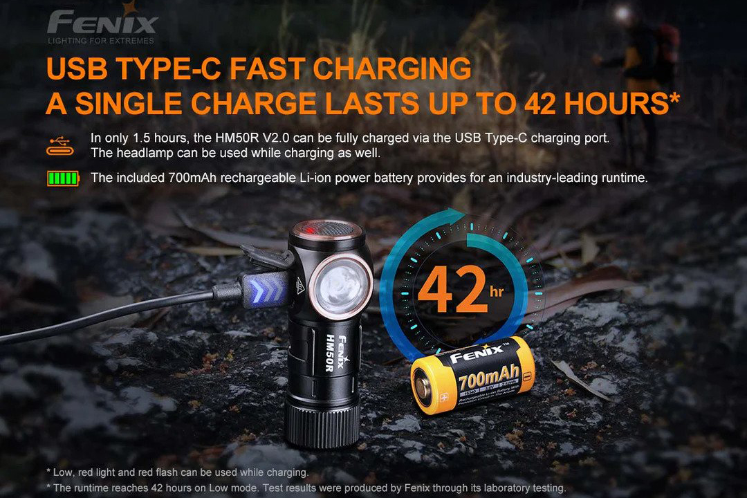 The long awaited upgrade to FenixåÕs best selling headlamp, the Fenix HM50R V2.0, has everything you have come to love plus added performance and new features. Super small and light weight, this headlamp can now blast a maximum 700 lumens 377ft. The included 16340 rechargeable li-ion battery is USB Type-C rechargeable, and the headlamp includes a battery level indicator so you will always know the batteryåÕs status. Use the red light mode for up close tasks or to preserve your night vision, and use the red flash as a signaling device. Dustproof, waterproof and impact resistant to 2 meters, the Fenix HM50R V2.0 Rechargeable Headlamp is tough enough to hang with the big boys, but wonåÕt weigh you down on those long backcountry trips.