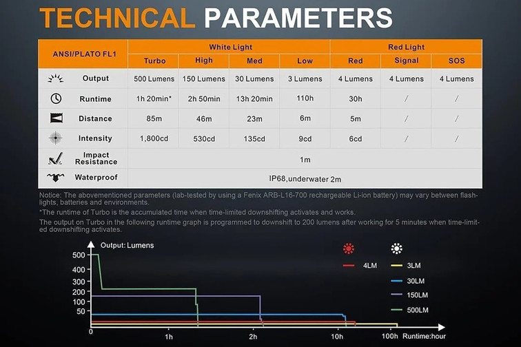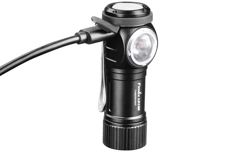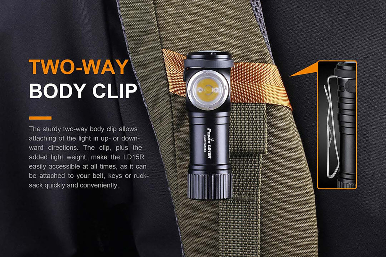 The Fenix LD15R rechargeable flashlight is a compact, hands-free light source that utilizes a right-angle headåÑperfect for those that need forward facing 90 degree wide angle light for high and low light situations. This light is compatible with MOLLE / Body Cam systems for the professional environment or can be a perfect fit to clip on your backpack for those personal hikes. The two-way body clip and magnetic base allow you to mount this light to just about anything. Powered by a rechargeable 16340 battery (included), this tiny flashlight blasts 500 lumens at a distance of 279 feet (85m). Easily switch between the seven lighting modes that include white and red light options. IP68 rated waterproof and dust proof build will ensure this light is there for you when you need it.