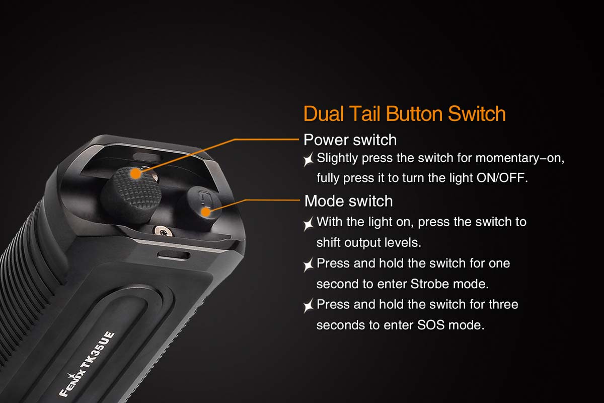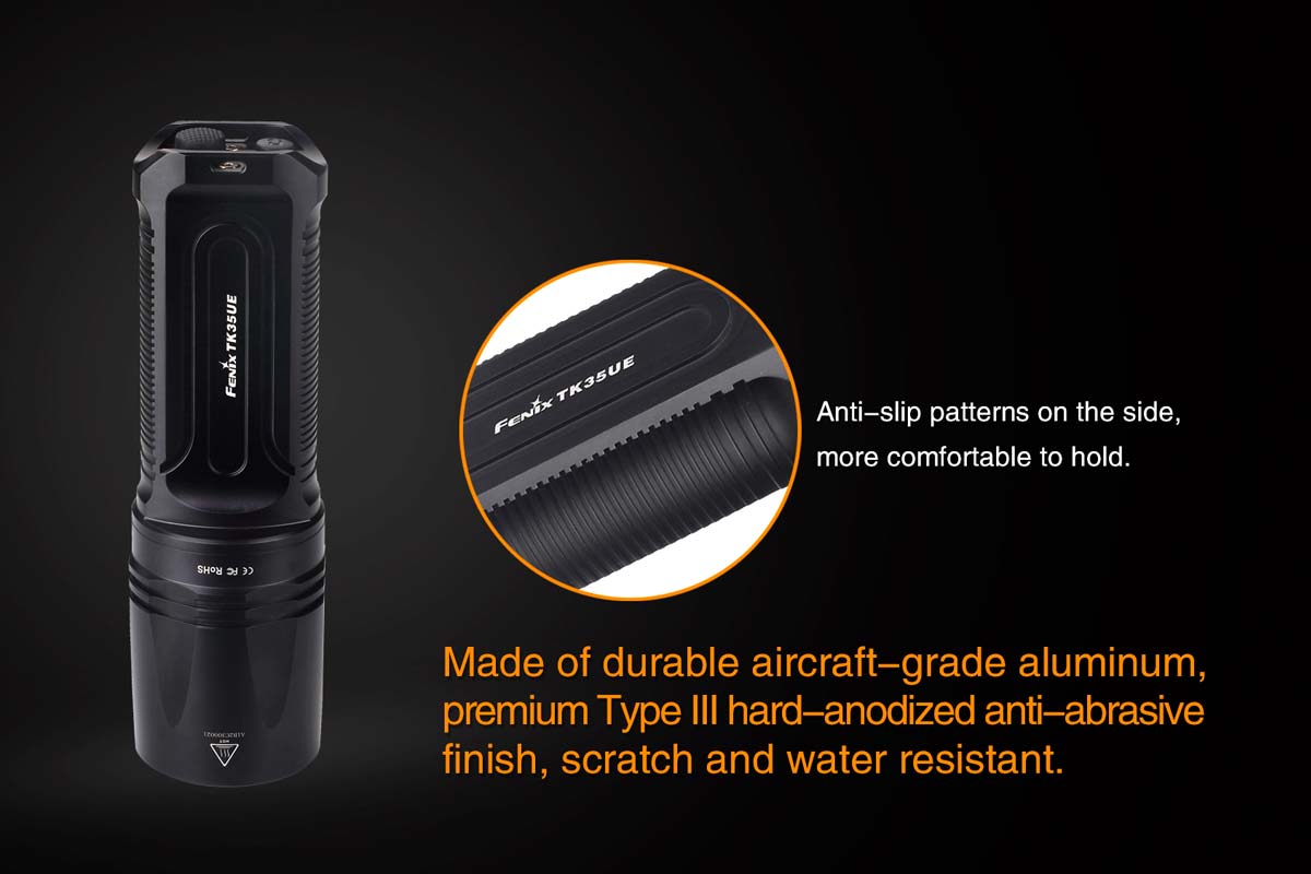 The Fenix TK35UE Ultimate Edition flashlight is newly updated with the latest Cree XHP 50 LED to allow for increased output and longer beam distance. The 2000 lumen TK35 Fenix Ultimate Edition features seven output options and dual tail switches in a more compact size that is a durable and well-balanced design for your hand.