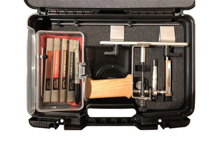 Delivered fully assembled, the system comes in a custom foam-lined hardshell storage case, which includes a 7 x 3-1/2 x 2 stone and accessory storage box. Additionally, four 6-inch KME Gold Series diamond stones are included, with one each of XC-140, C-300, F-600, and XF-1500.