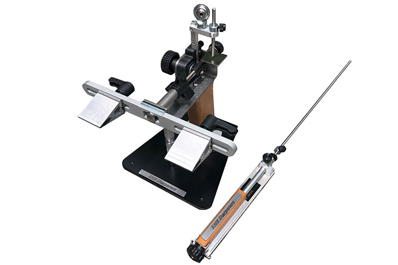 This system accommodates a maximum blade thickness of 3/8 for saber grinds and 3/16 for full flat grinds, and can sharpen blades up to 20 or more in length. It offers an angle range from 10 degrees to 45 degrees per side.