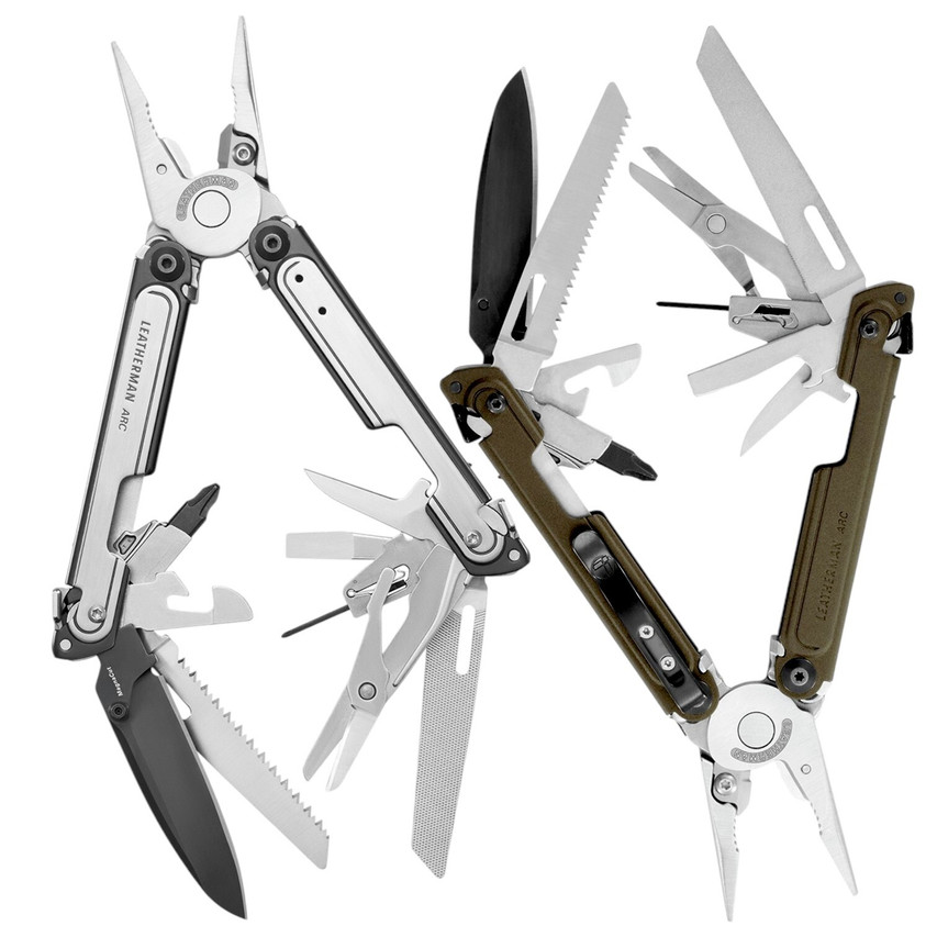 The Arc carries 20 integrated tools, including needlenose and regular pliers, replaceable wire and hard-wire cutters, spring-action scissors, a diamond-coated file, saw, awl, and large and small bit drivers. The large driver accepts standard Leatherman bits and pairs with the Leatherman Bit Kit for extended capability. The Arc does not include a sheath or bit kit in the box, so factor those accessories into the build if you need them. Explore the full Leatherman Wave Alpha lineup for the closest comparison in the premium MagnaCut tier.