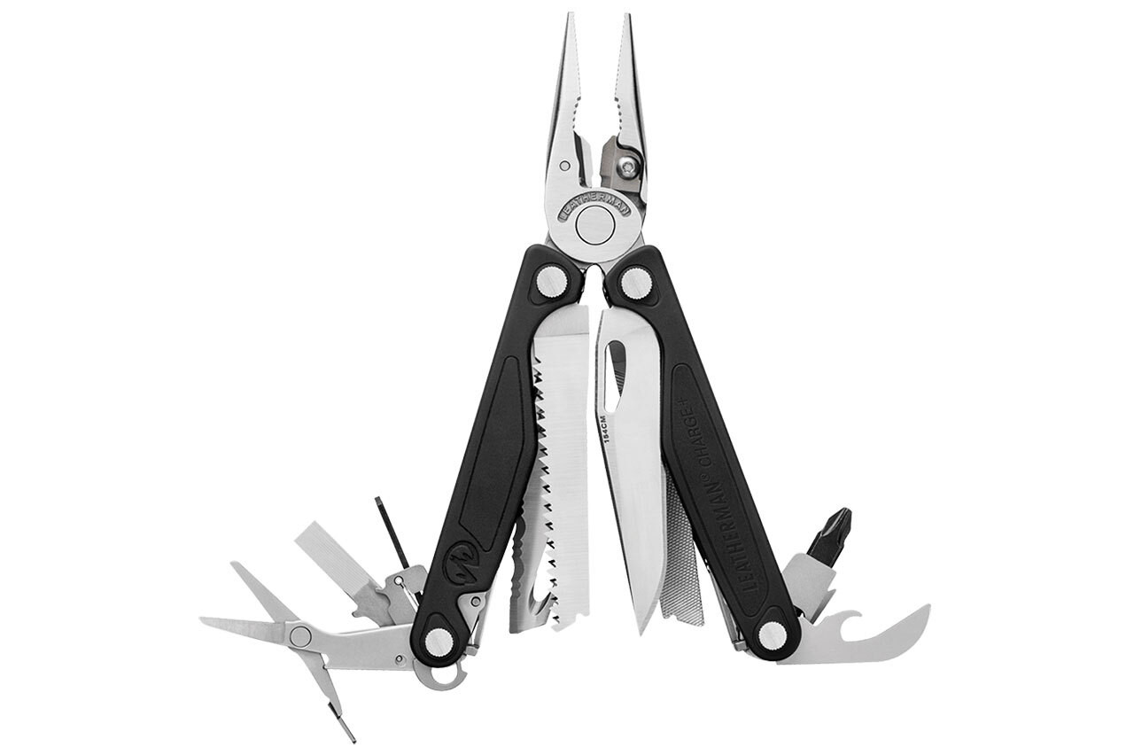 The Charge Plus runs 19 integrated tools in a 4-inch closed frame weighing 8.3 ounces. The 6061-T6 hard-anodized aluminum handle inlays lighten the tool versus a full stainless steel body while adding wear resistance against field abuse. The full tool set includes needlenose and regular pliers, replaceable wire and hard-wire cutters, electrical crimper, wire stripper, 154CM plain edge blade, 420HC serrated blade, saw, spring-action scissors, awl with thread loop, 8-inch ruler, can and bottle opener, wood and metal file, diamond-coated file, and two bit drivers. Every feature except the plier head locks when deployed and is one-hand operable.