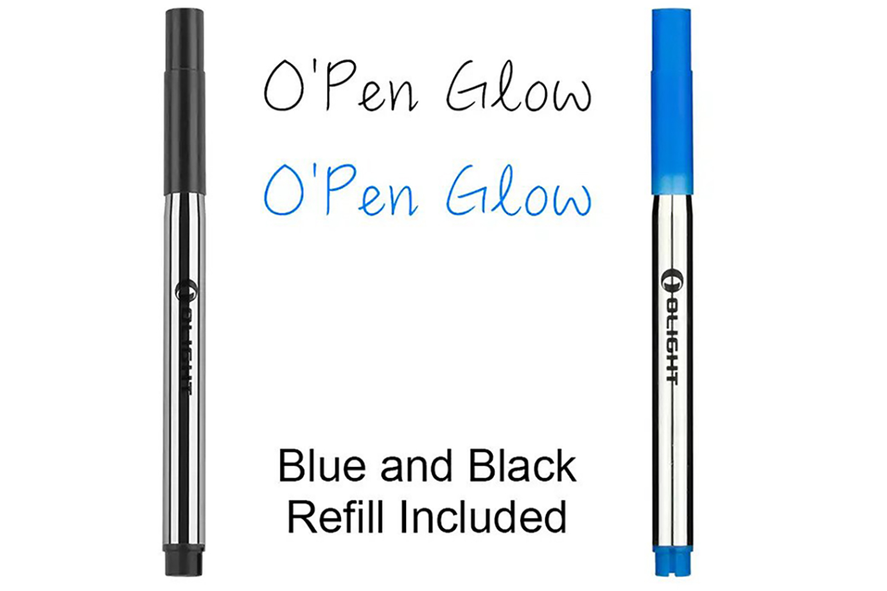 Included: O'Pen Glow ( Black Refill Included ) x 1, Blue Refill x 1, Type-C Charging Cable x 1, Charging Base x 1, Magnetic badge x 1, User Manual x 1