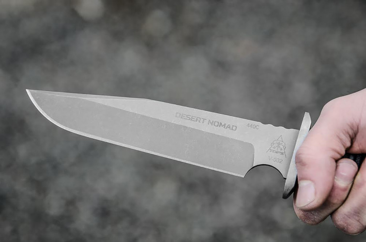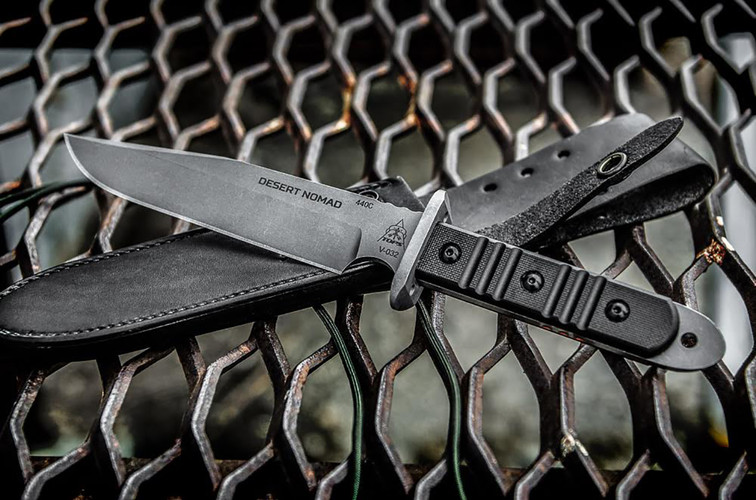 The Desert Nomad is ready to roam. This combat-oriented knife has a lot of smart features in a light package. 440C stainless steel makes maintenance a breeze. The aluminum bolster (made from 6061 T-6 aircraft aluminum) not only protects the hand from slipping onto the blade, but can protect the hand from the knife of an attacker as well. The slight clip point with swedge gives great penetration power. Its lightweight and nimble, which makes it easy to carry and great for quick slashing cuts. The splitter on the back gives the user another strike option in a defense/combat situation. The G10 handles have traction to provide a solid purchase on the knife. Finish it off with a secure black leather sheath for a quieter draw than nylon or Kydex.