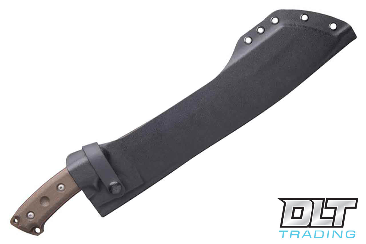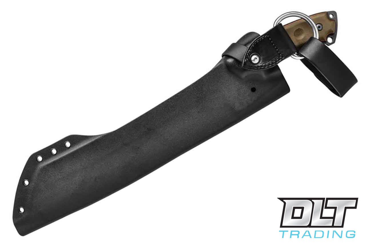 TOPS wanted the handles to be thick enough to fill each user's hand like a hatchet or small ax handle would, so they decided to use sandwiched Micarta. It's well rounded for comfort and the black canvas Micarta underneath the green canvas Micarta adds even more to the aesthetics of this piece.