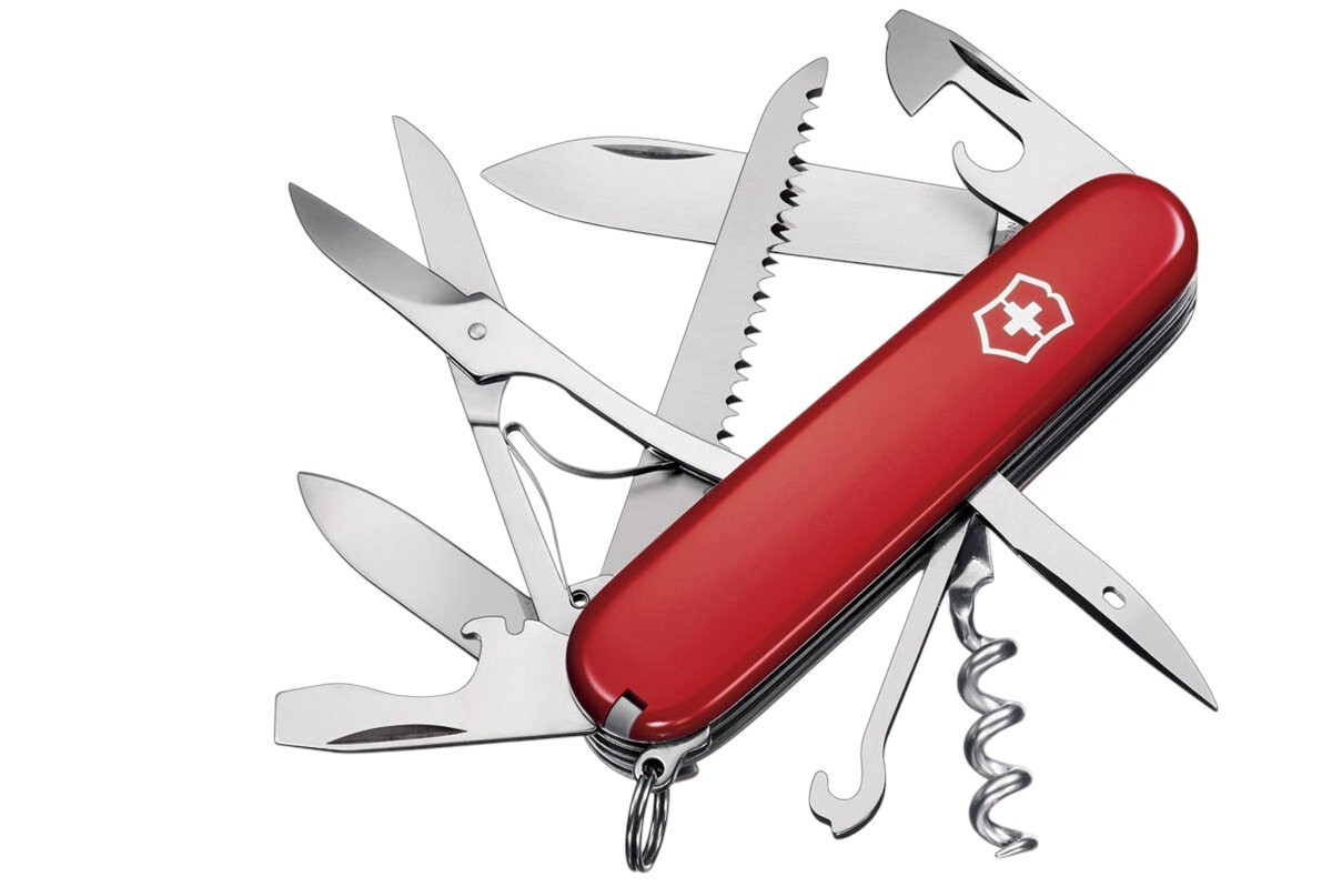 Beyond the saw and scissors, the Huntsman carries the Officer's knife foundation. Large and small blades handle cutting tasks from food prep to feather sticks. The can opener and bottle opener remain as functional as they were when Victorinox first designed them. A corkscrew pulls corks or backs out small screws in a pinch. The reamer punches holes in leather or fabric and handles awl work. Screwdrivers in 6mm and 3mm widths cover common fasteners.