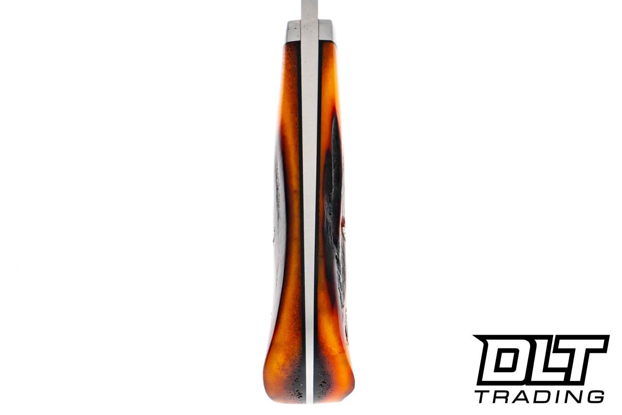 W.A. Surls Loveless Lil Drop Point CPM-154 - Amber Stag - Black Liners - Satin Guard - Tapered Tang
