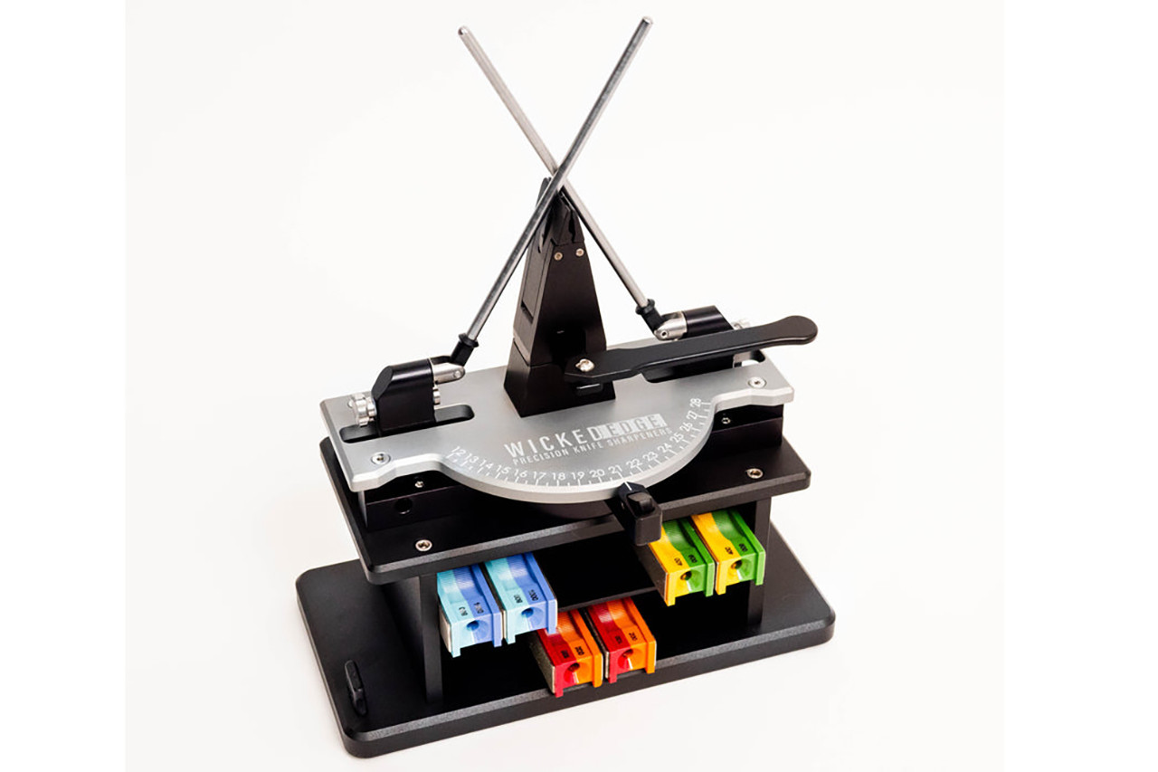 The core of every Wicked Edge sharpener is the dual-arm guide rod design. Two independently controlled sharpening arms work both sides of the blade simultaneously at matched angles, producing symmetrical bevels in roughly a quarter of the time a single-arm system requires. That matters for more than just speed — because both sides of the edge are worked at the same rate, the apex stays centered on the blade's original geometry rather than drifting as you flip back and forth on a single-sided platform. The patented design also avoids the work-hardening that some single-arm and powered systems can introduce, which means Wicked Edge-sharpened edges hold up longer under hard use without rolling or chipping. Every sharpener in the lineup is designed, machined, and assembled in the USA, built with airplane-grade aluminum components and backed by a lifetime warranty on every model except the Venture Series portable sharpener, which carries a five-year warranty.