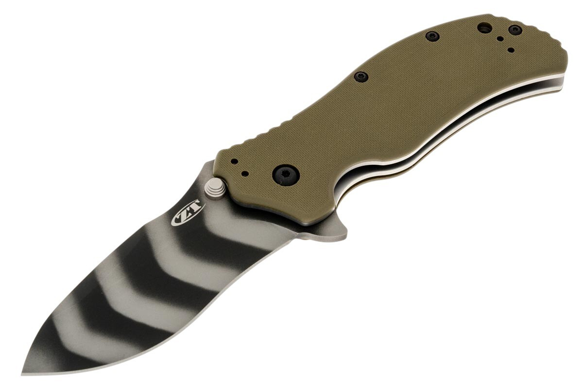 The 0350 runs a 3.25-inch drop point recurve ground from CPM S30V on the standard and Tigerstripe models, stepping up to CPM MagnaCut on the OLTS OD Green variant. The recurve belly is what separates the 0350 from the rest of the ZT lineup. It bites into rope, cardboard, and fibrous material harder than a straight edge and pulls through draw cuts with aggressive efficiency, which is why the platform became a favorite with contractors, utility workers, and anyone who cuts for a living. SpeedSafe assisted opening fires the blade into lockup through a flipper tab or ambidextrous thumb studs. The torsion bar keeps the blade securely closed under light pressure and then drives it open decisively once the detent breaks.